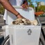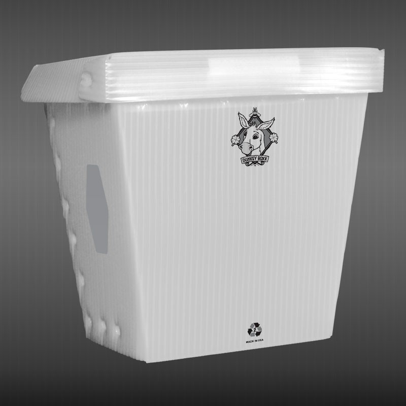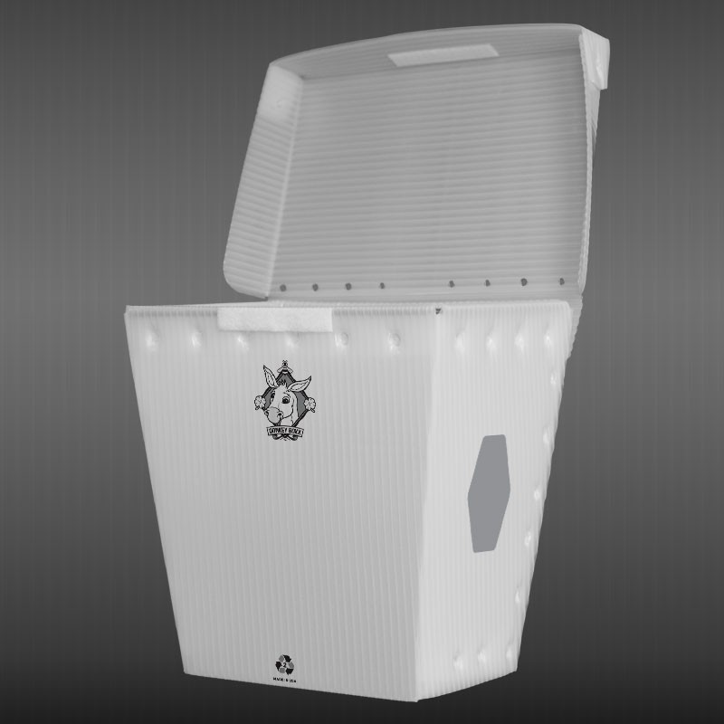 Donkey Boxx is a high utility low cost bicycle pannier that easily attaches to your bike's rack for everyday cycling errands and special needs that you find fit. The lightweight 80% recycled corrugated plastic box-like construction allows for durability and use in wet weather. The broad flat outside surface provides for each rider's unique personalization. Each Donkey Boxx contains a kit with two reflective stickers, a Velcro closure for the lid and wire ties for mounting. Made in America. Color: natural/translucent.